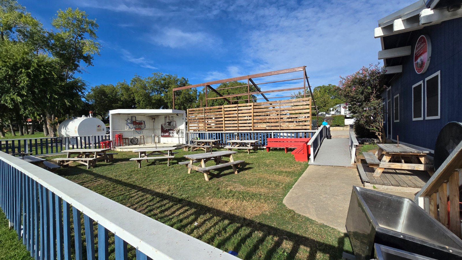 Live music! Outdoor seating with picnic tables, or fold chairs and table. Family atmosphere. Loved it. The food was great! I had a brisket baked potato. Yum!